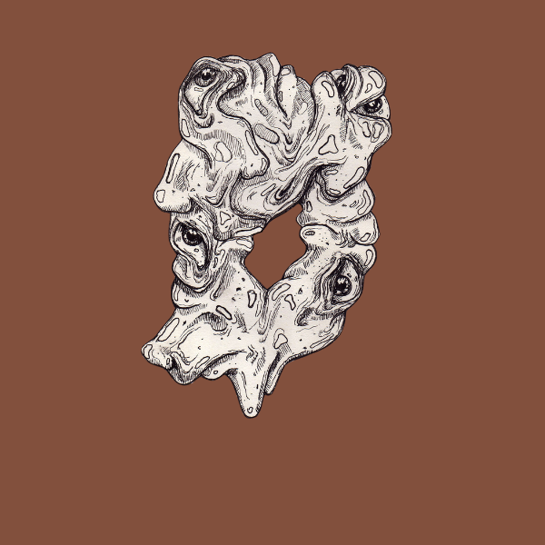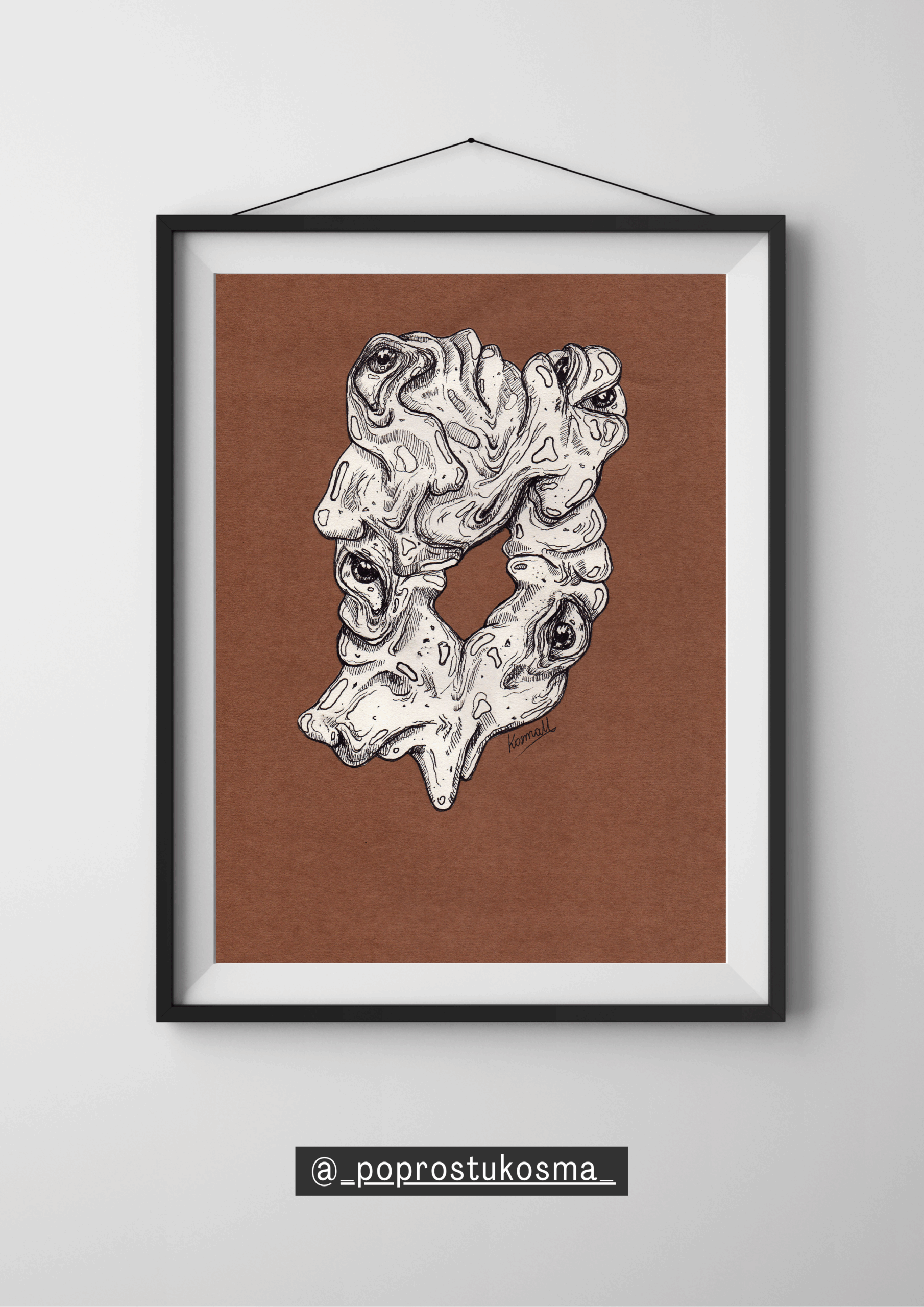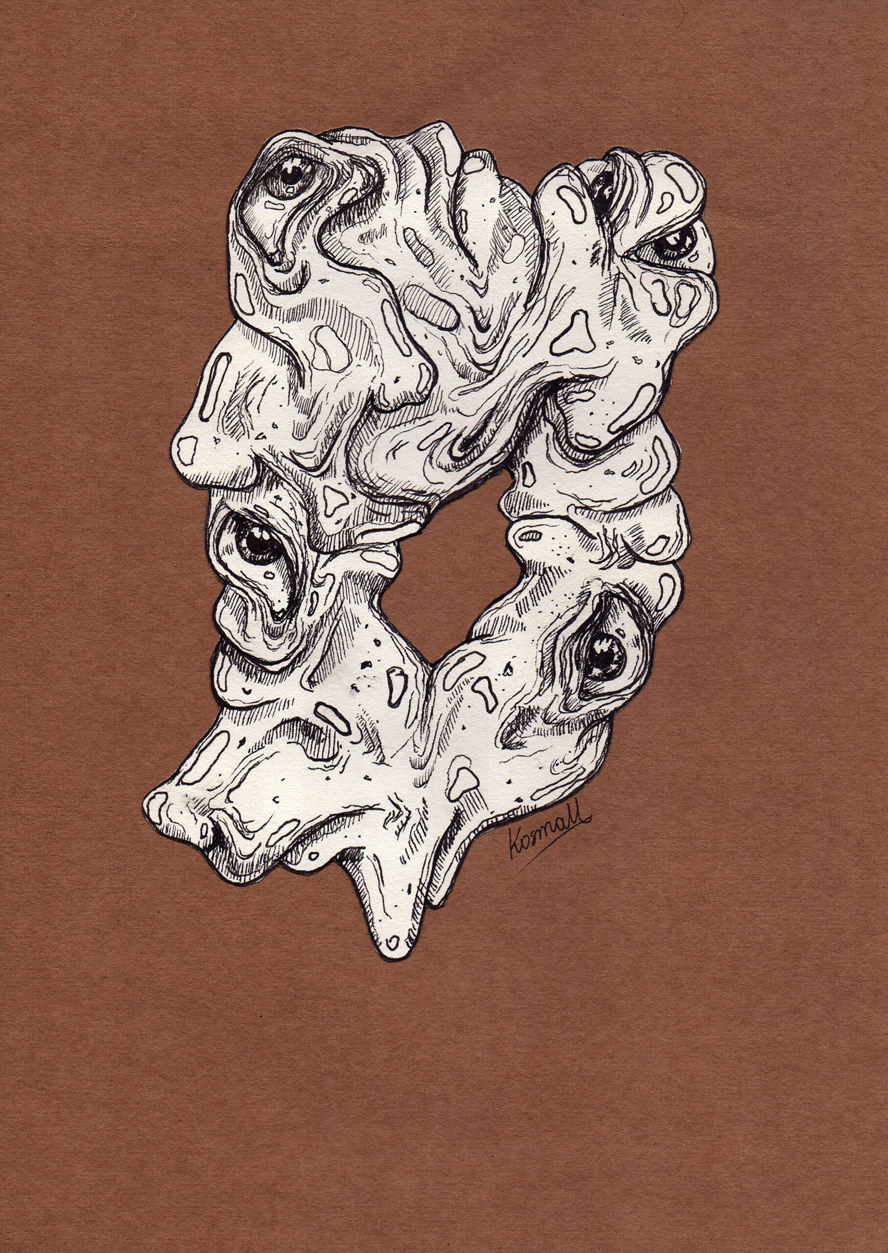 Intrygująca forma organiczna, w której płynne kształty splatają się z realistycznymi, czujnymi oczami. Rysunek wykonany tuszem na papierze o ciepłym, brązowym odcieniu, łączy w sobie elementy surrealizmu i biologicznej abstrakcji.