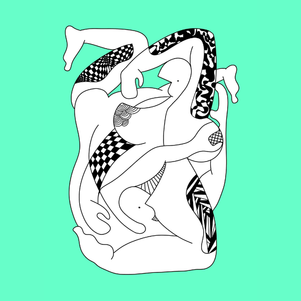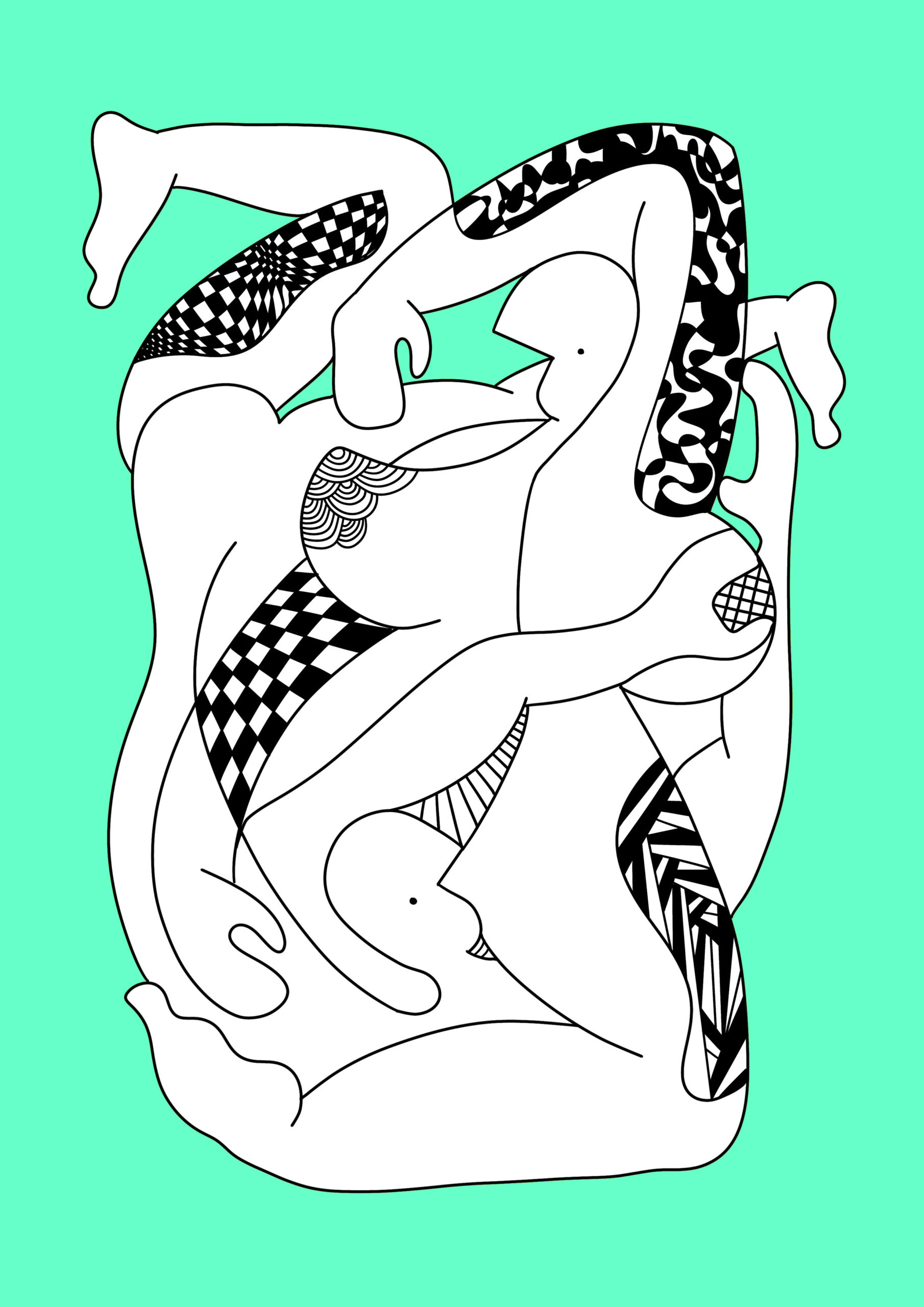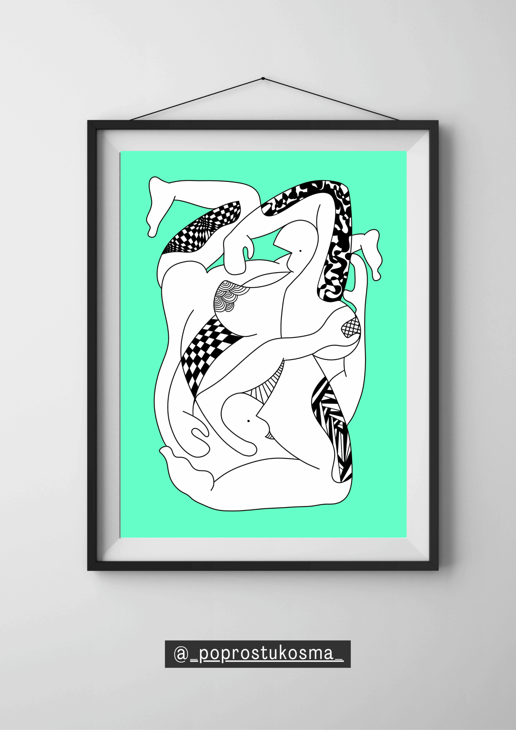 Subtelna, a zarazem dynamiczna grafika ukazująca splecione figury w płynnym, tanecznym ruchu. Czarno-białe wzory w połączeniu z miętowym tłem tworzą świeży, harmonijny efekt, przyciągając wzrok i wprowadzając do przestrzeni nutę nowoczesnej elegancji.