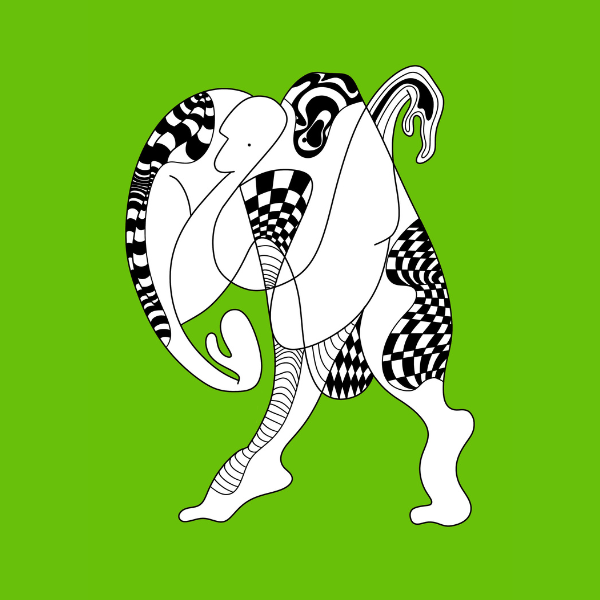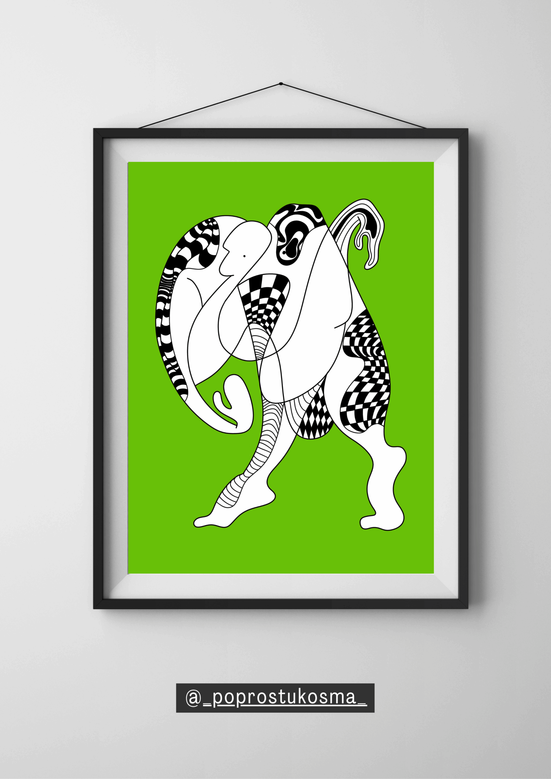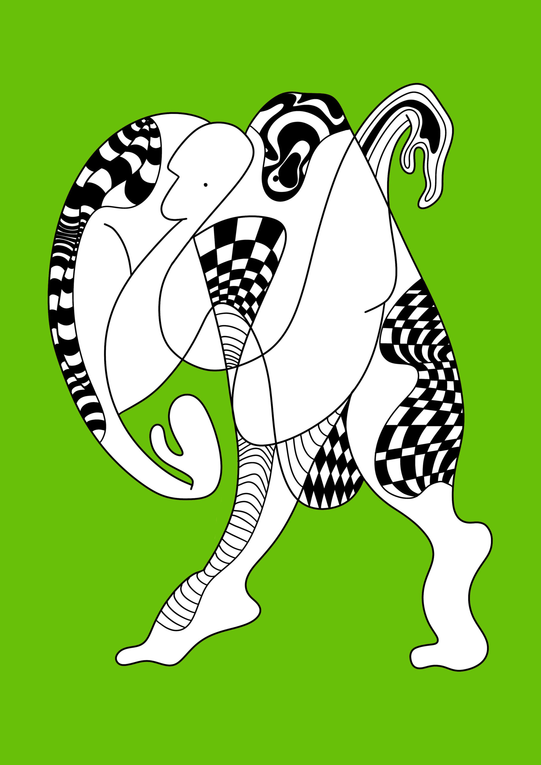 Ta energetyczna grafika ukazuje ekspresyjnie splecione postacie, tętniące ruchem i życiem. Dynamiczne wzory w czerni i bieli kontrastują z intensywnym, świeżym zielonym tłem, budując wrażenie pulsującej energii i nieustannej transformacji.