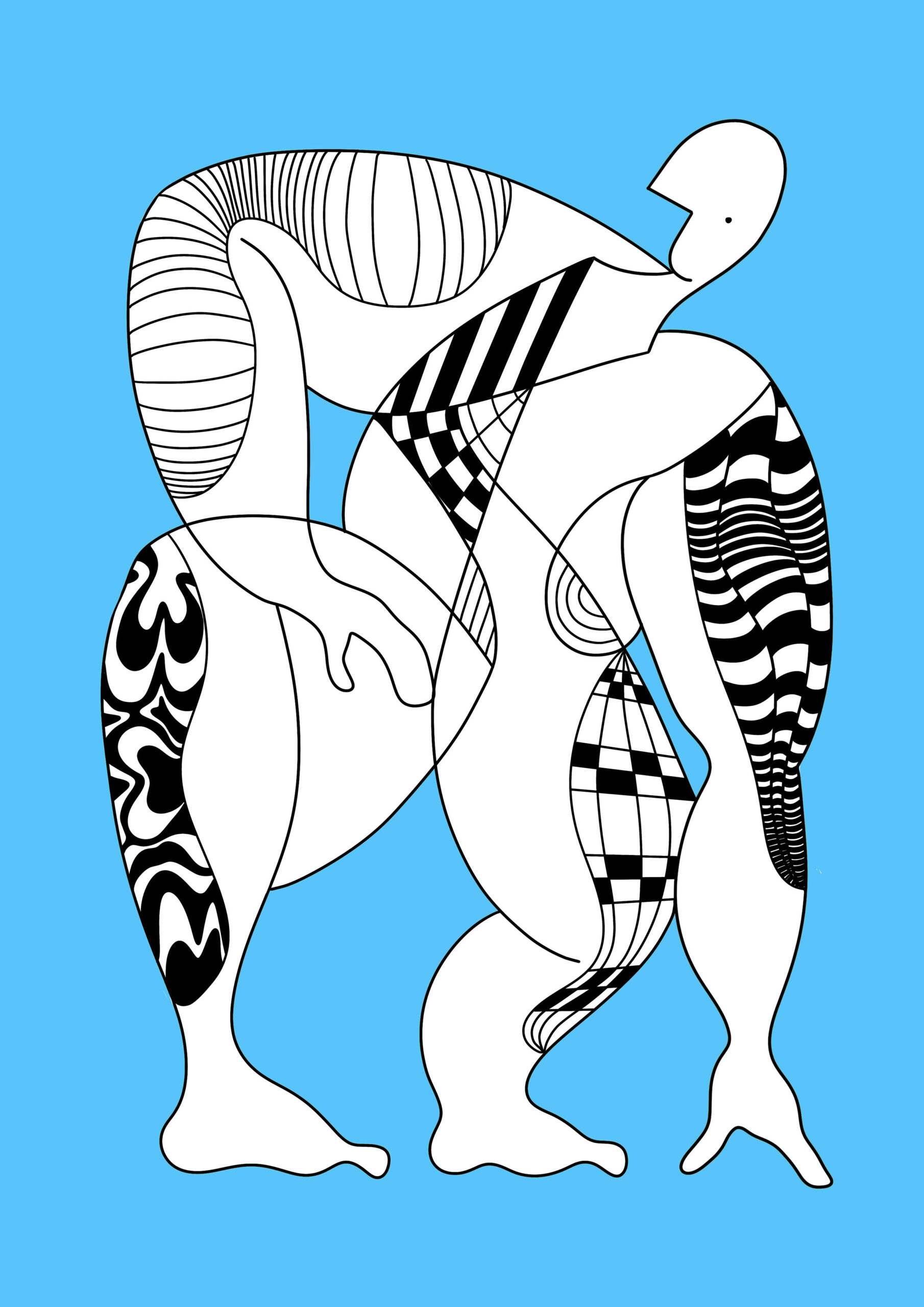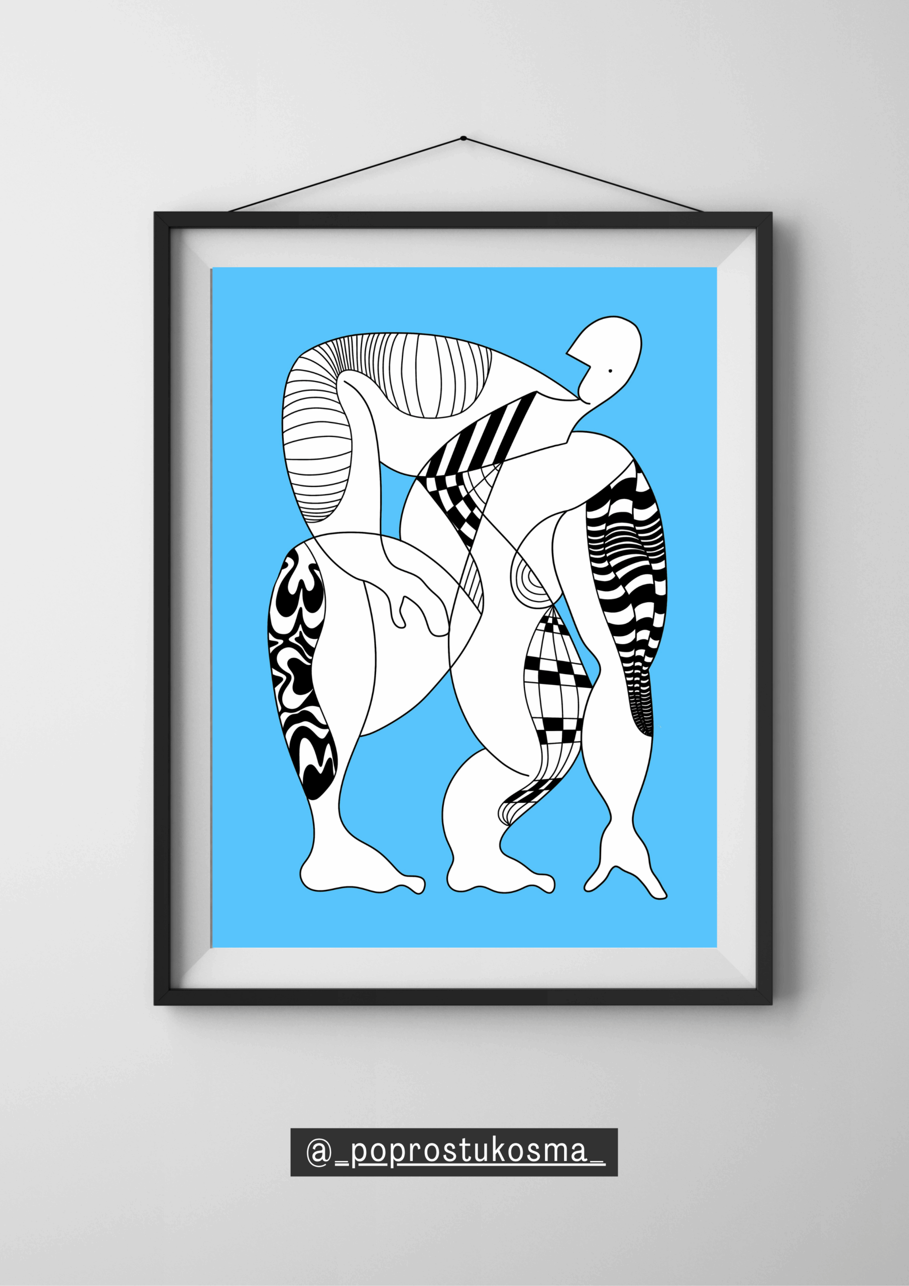 Monumentalna postać zamrożona w ruchu, zbudowana z dynamicznych linii i czarno-białych wzorów. Błękitne tło nadaje pracy lekkości i przestrzeni, kontrastując z intensywnością form. Grafika emanuje siłą, ruchem i harmonią, idealnie komponując się z nowoczesnym wystrojem wnętrz.