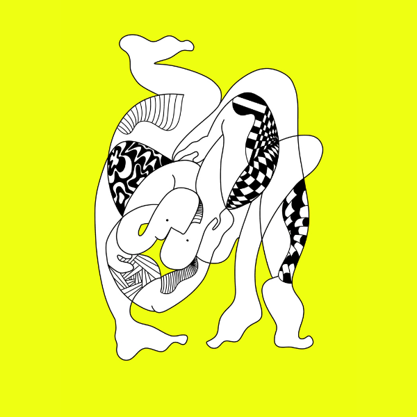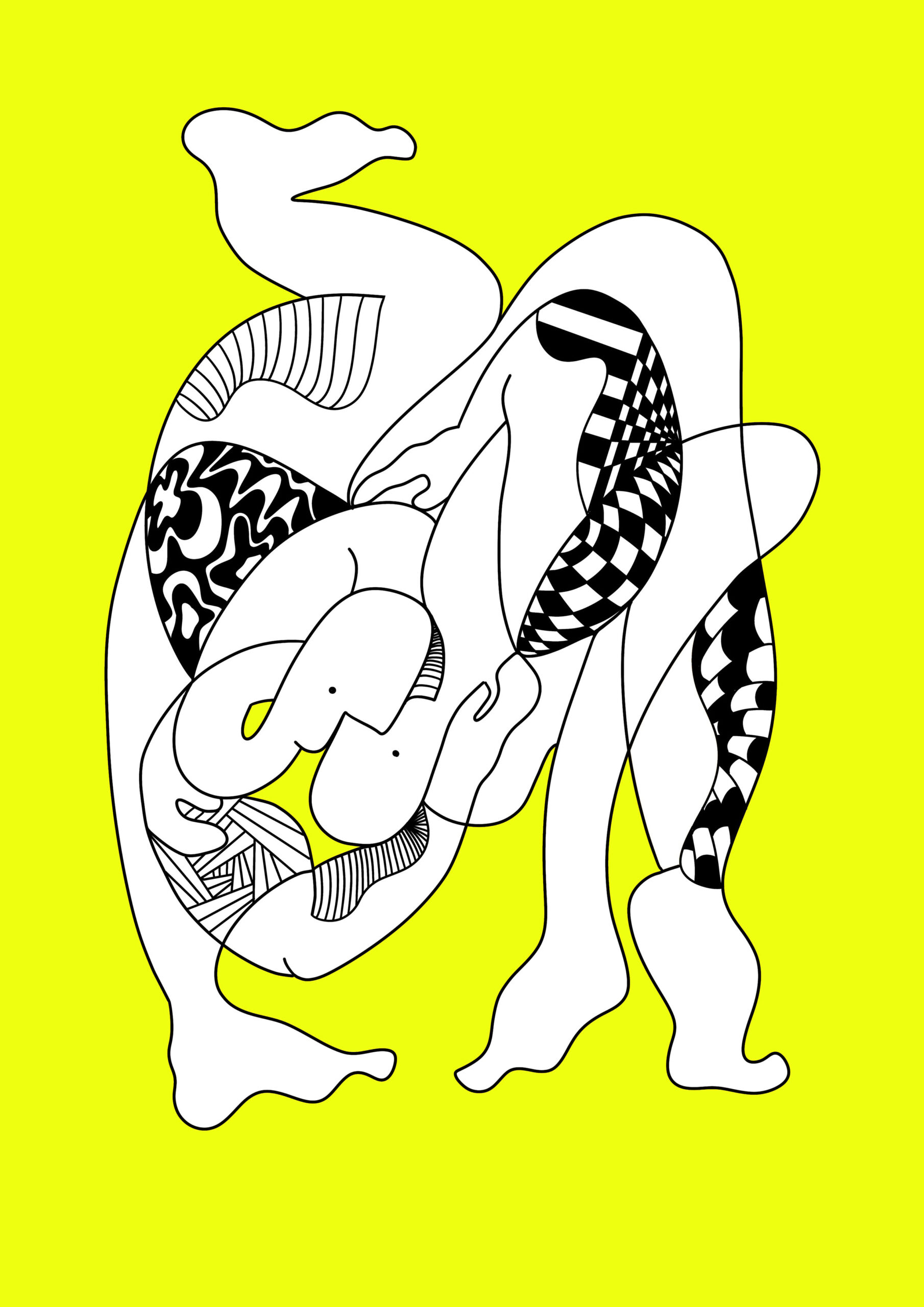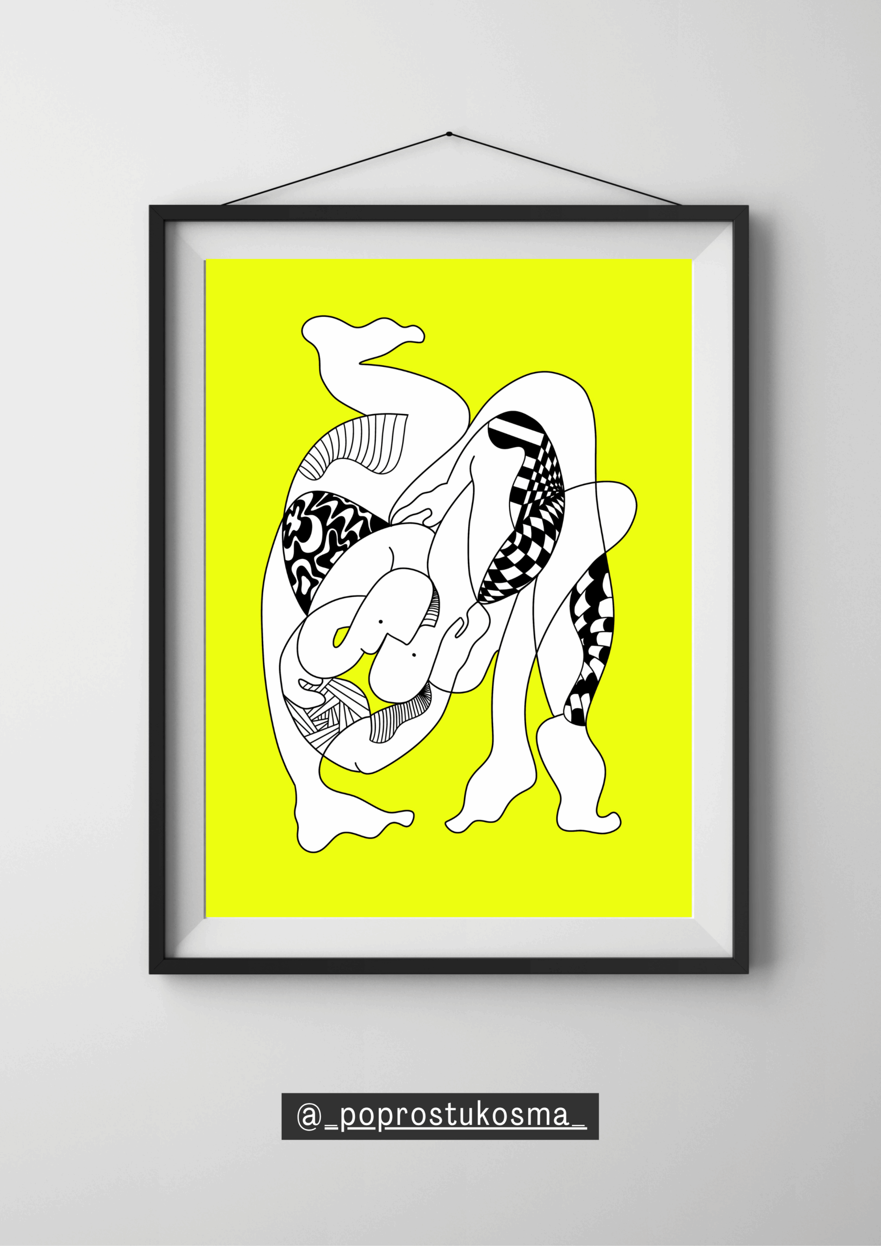 Wyrazista, dynamiczna kompozycja ukazująca splątane sylwetki w energetycznym tańcu form. Żywe, neonowo-żółte tło kontrastuje z czarno-białymi wzorami, podkreślając rytm, ruch i emocjonalną ekspresję obrazu.
