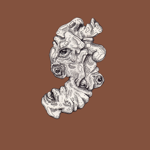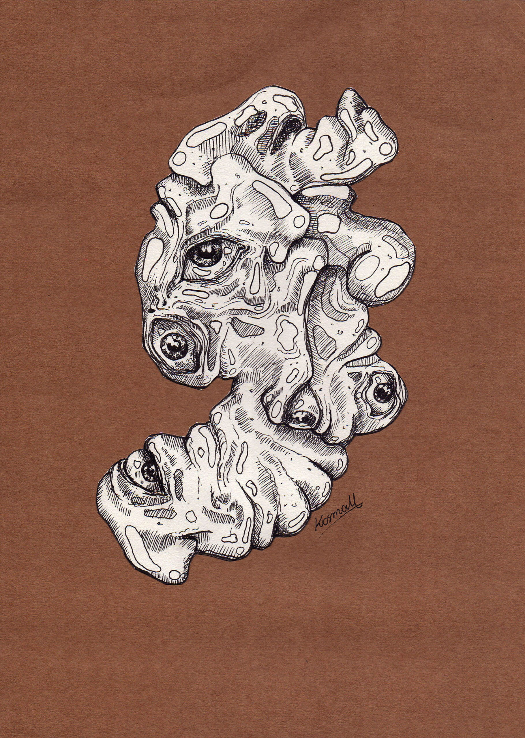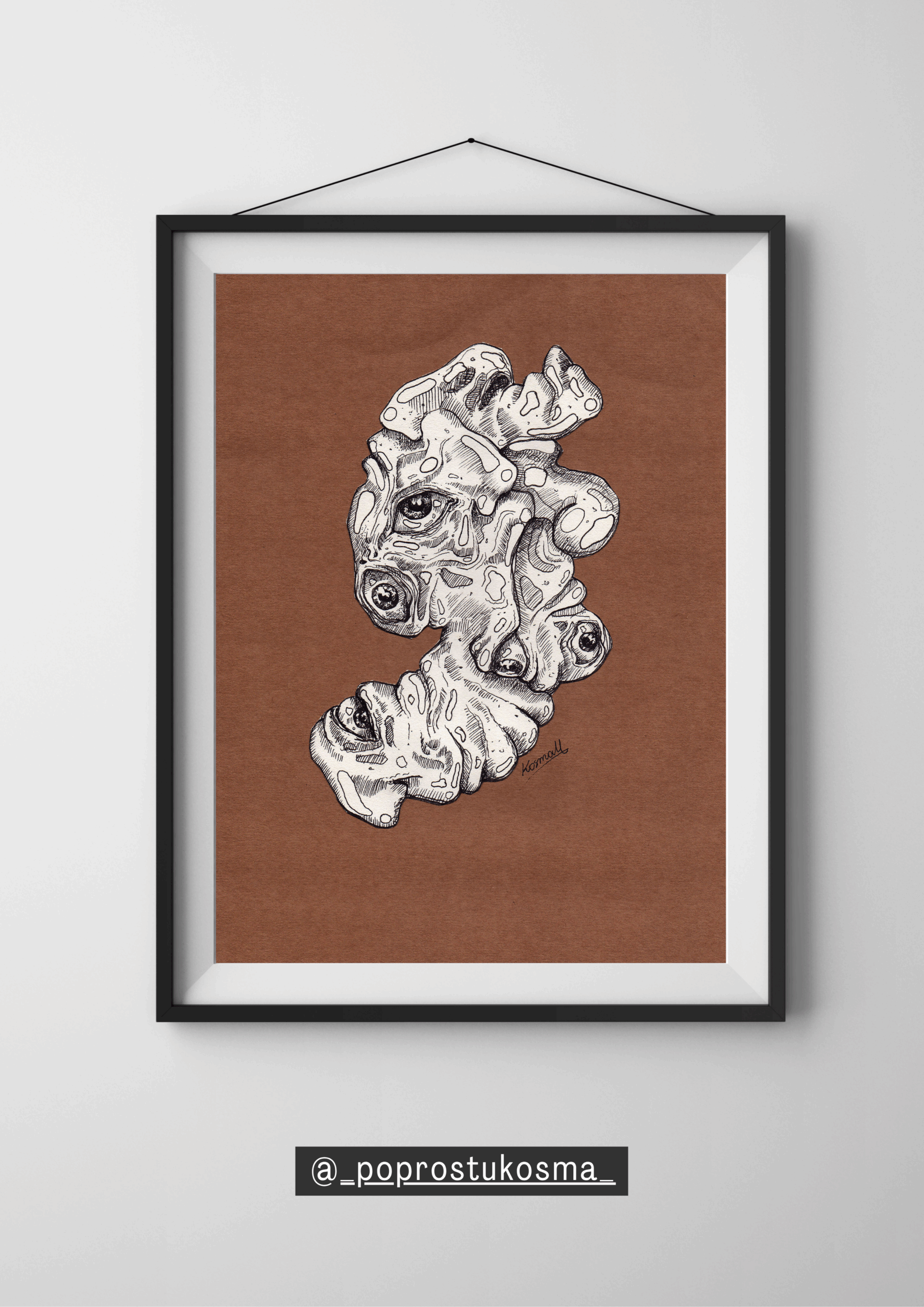 Hipnotyzująca organiczna struktura wypełniona realistycznie odwzorowanymi oczami, które zdają się obserwować z każdej strony. Rysunek wykonany tuszem na ciepłym, brązowym papierze tworzy iluzję istoty utkanej z emocji, wspomnień i czujności.